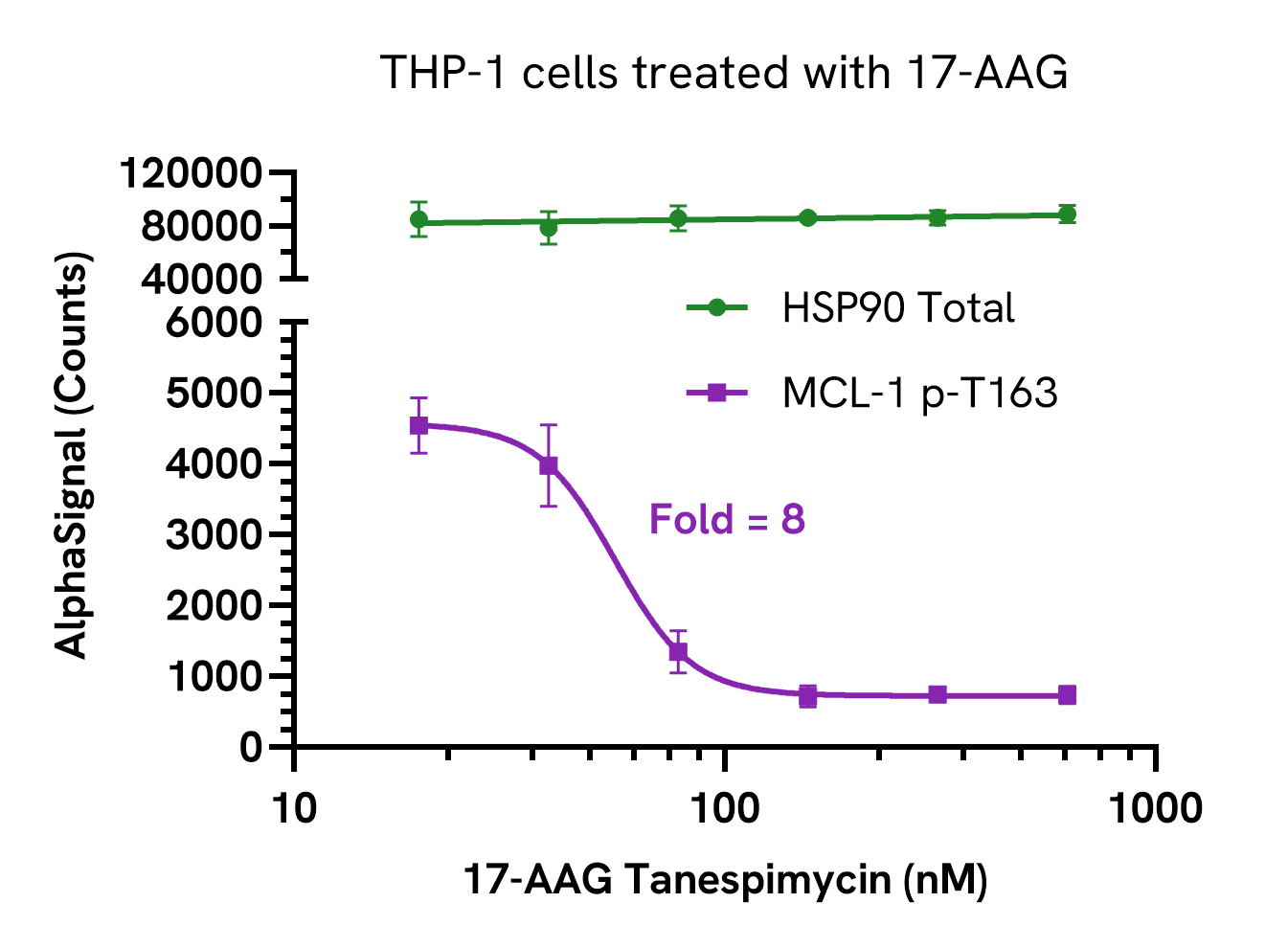 Data obtained with a 2 plate, 2 incubation protocol. THP-1 cells were seeded at 100K cells/well in a 96 well plate in complete medium and treated with 17-AAG (HSP90 inhibitor) at the indicated concentrations for 24 hours. Cells were washed in HBSS and lysed with Lysis Buffer. Lysates were further diluted for Total HSP90 and assayed separately for Total HSP90 and Phospho (Thr163) MCL-1 using respective SureFire® Ultra™ kits. Equivalent to approximately 1,000 cells/datapoint (Total HSP90) or 10,000 cells/datapoint (Phospho MCL-1).