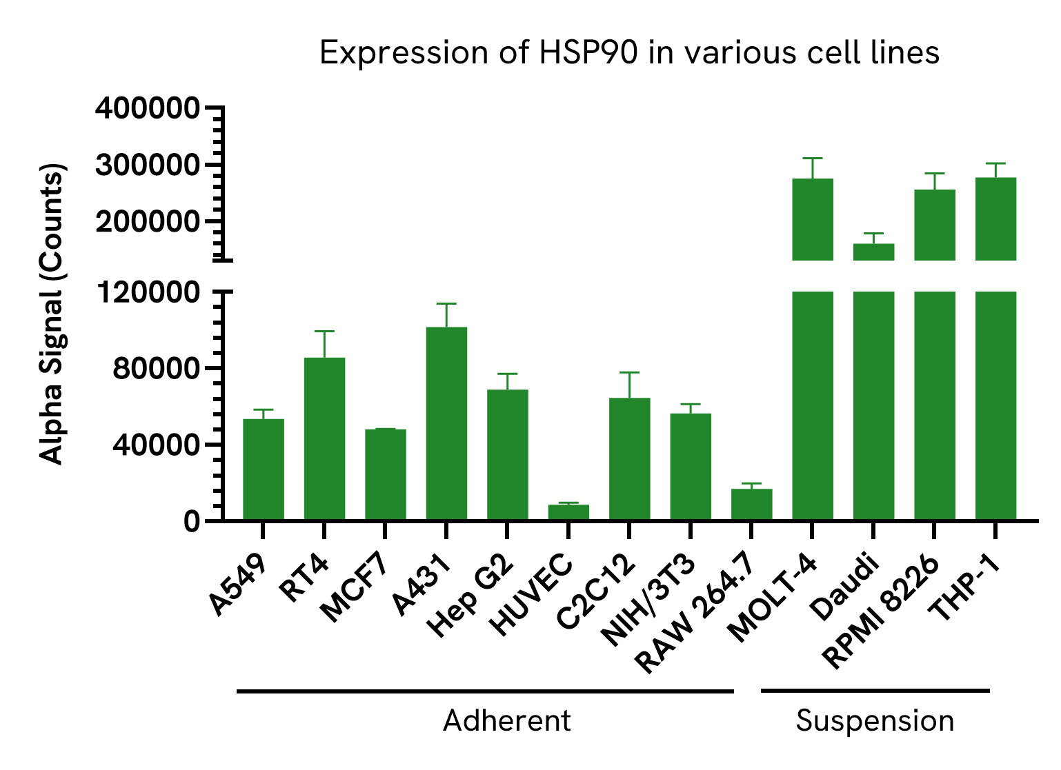 Data obtained from measurement of HSP90 Total in various cell types lysed with Lysis Buffer. Equivalent to approximately 500 cells/datapoint (adherent cells) or 5,000 cells/datapoint (suspension cells).