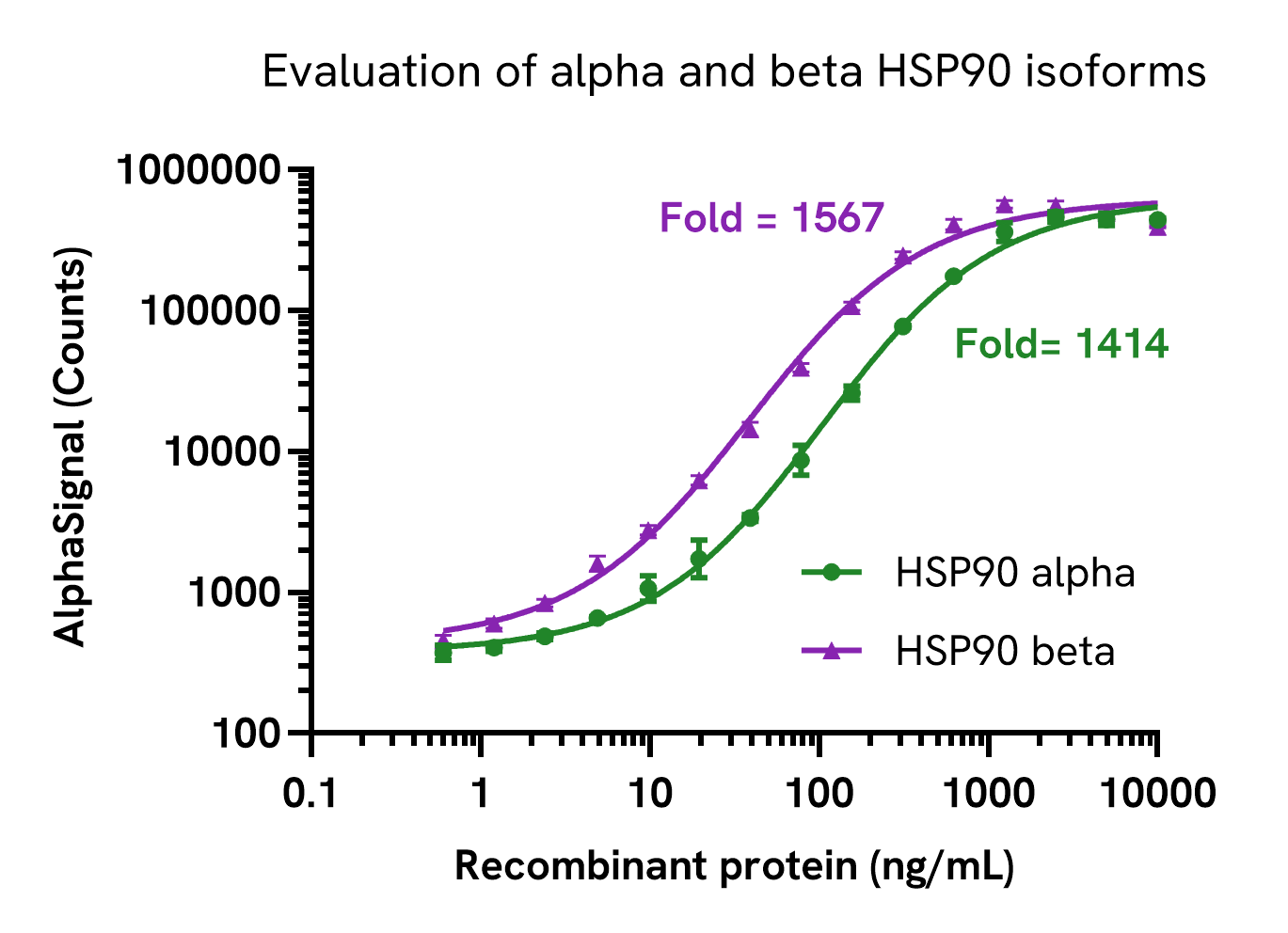 Recombinant HSP90 alpha protein (ab80369) and recombinant HSP90 beta protein (ab80033) were serially diluted with Dilution Buffer. HSP90 levels were assessed using the Total HSP90 SureFire® Ultra™ kit to evaluate the assay reactivity to both alpha and beta variants of HSP90 protein.