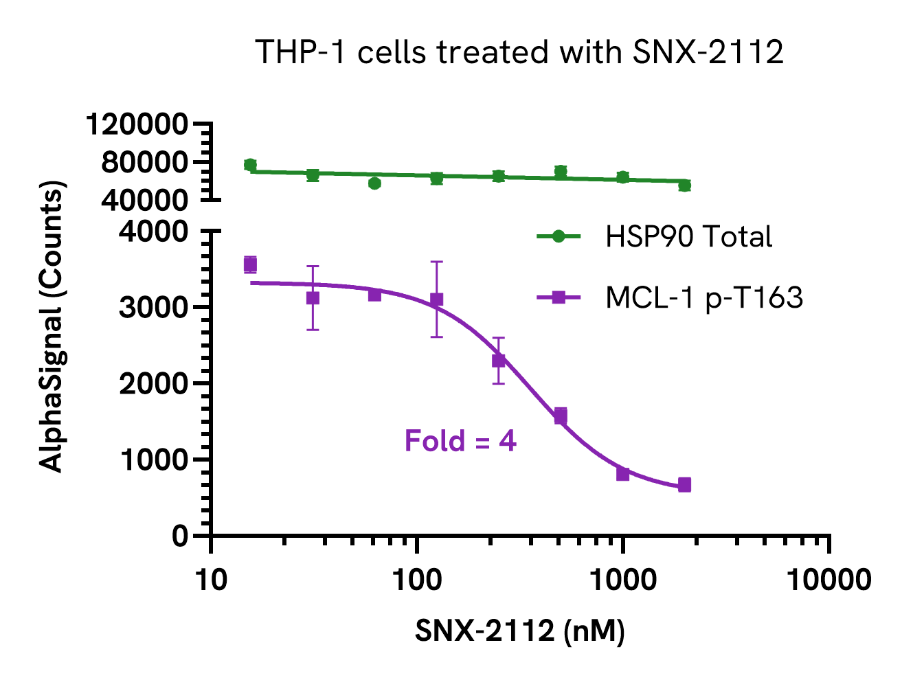 Data obtained with a 2 plate, 2 incubation protocol. THP-1 cells were seeded at 100K cells/well in a 96 well plate in complete medium and treated with SNX-2112 (HSP90 inhibitor) at the indicated concentrations for 24 hours. Cells were washed in HBSS and lysed with Lysis Buffer. Lysates were further diluted for Total HSP90 and assayed separately for Total HSP90 and Phospho (Thr163) MCL-1 using respective SureFire® Ultra™ kits. Equivalent to approximately 1,000 cells/datapoint (Total HSP90) or 10,000 cells/datapoint (Phospho MCL-1).
