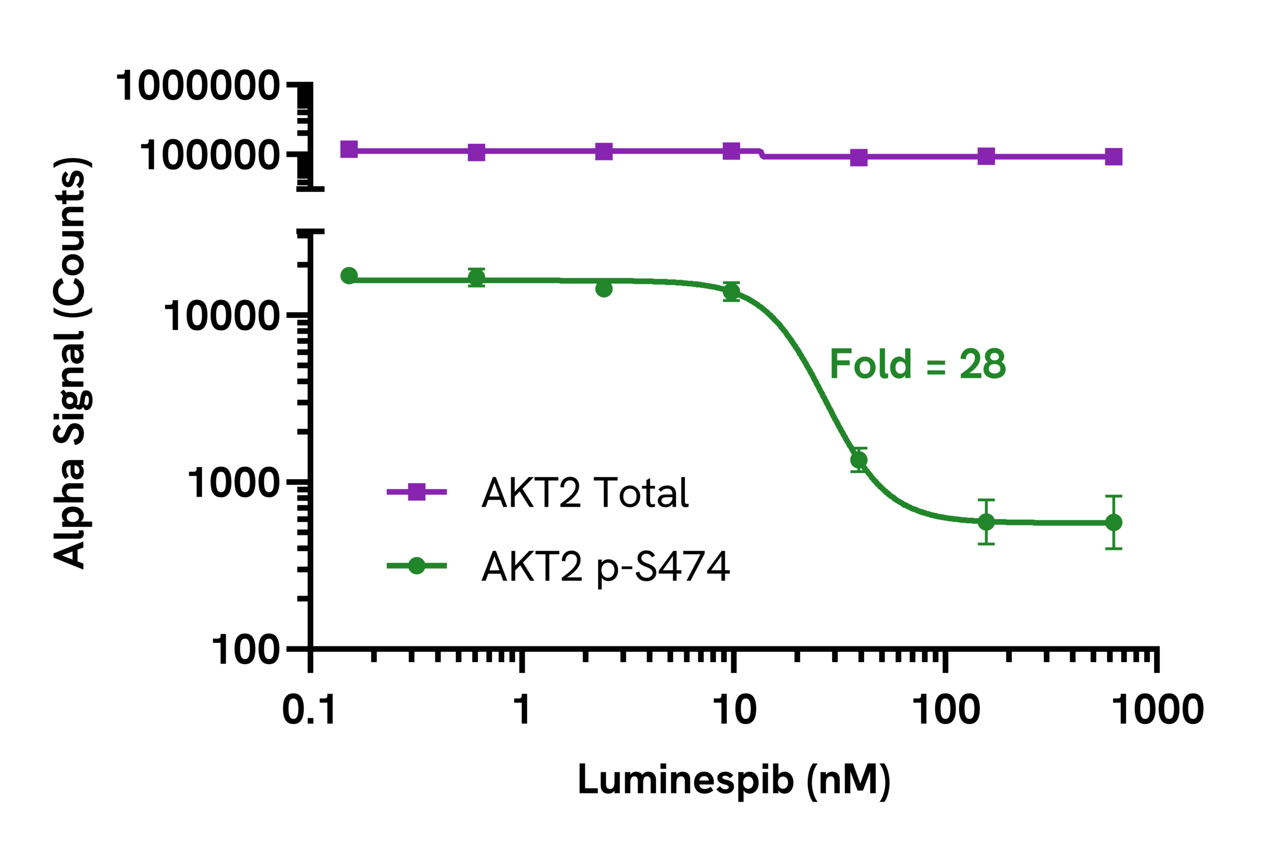 Data obtained with a 2-plate, 2-incubation protocol. HEK293 cells were seeded at 40K cells/well in a 96 well plate and incubated overnight. Cells were treated with Luminespib at the indicated concentrations for 24 hours. Cells were lysed with Lysis Buffer and assayed separately for Phospho (Ser474) and Total AKT2 using respective SureFire® Ultra™ kits. Equivalent to approximately 4,000 cells/datapoint.