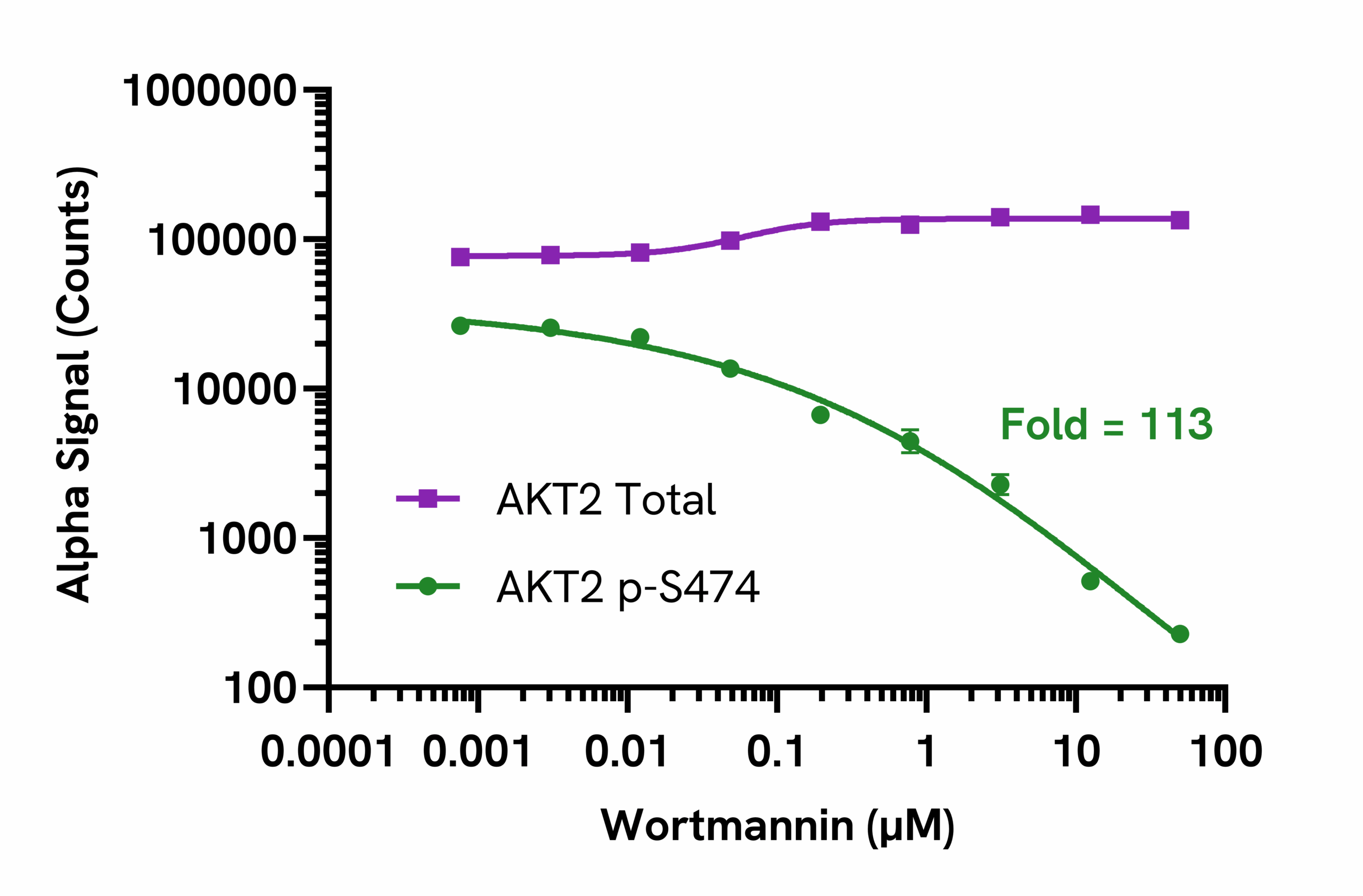 Data obtained with a 2-plate, 2-incubation protocol. HEK293 cells were seeded at 40K cells/well in a 96 well plate and incubated overnight. Cells were treated with Wortmannin at the indicated concentrations for 2 hours. Cells were lysed with Lysis Buffer and assayed separately for Phospho (Ser474) and Total AKT2 using respective SureFire® Ultra™ kits. Equivalent to approximately 4,000 cells/datapoint.