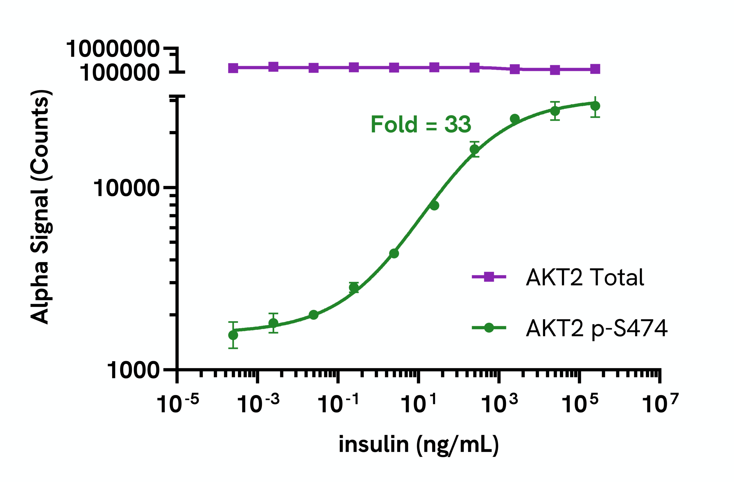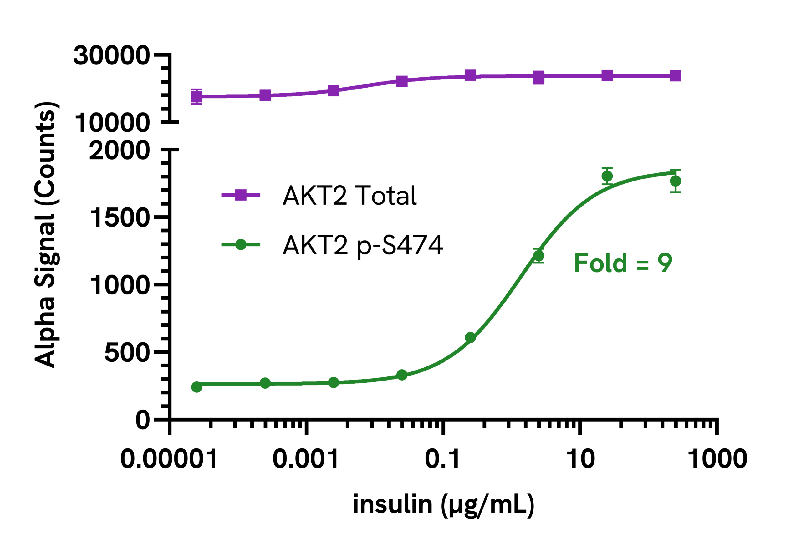 Data obtained with a 2-plate, 2-incubation protocol. MCF7 cells were seeded at 40K cells/well in a 96 well plate and incubated overnight. Cells were serum starved for 2 hours, then treated with insulin at the indicated concentrations for 30 minutes. Cells were lysed with Lysis Buffer and assayed separately for Phospho (Ser474) and Total AKT2 using respective SureFire® Ultra™ kits. Equivalent to approximately 4,000 cells/datapoint.