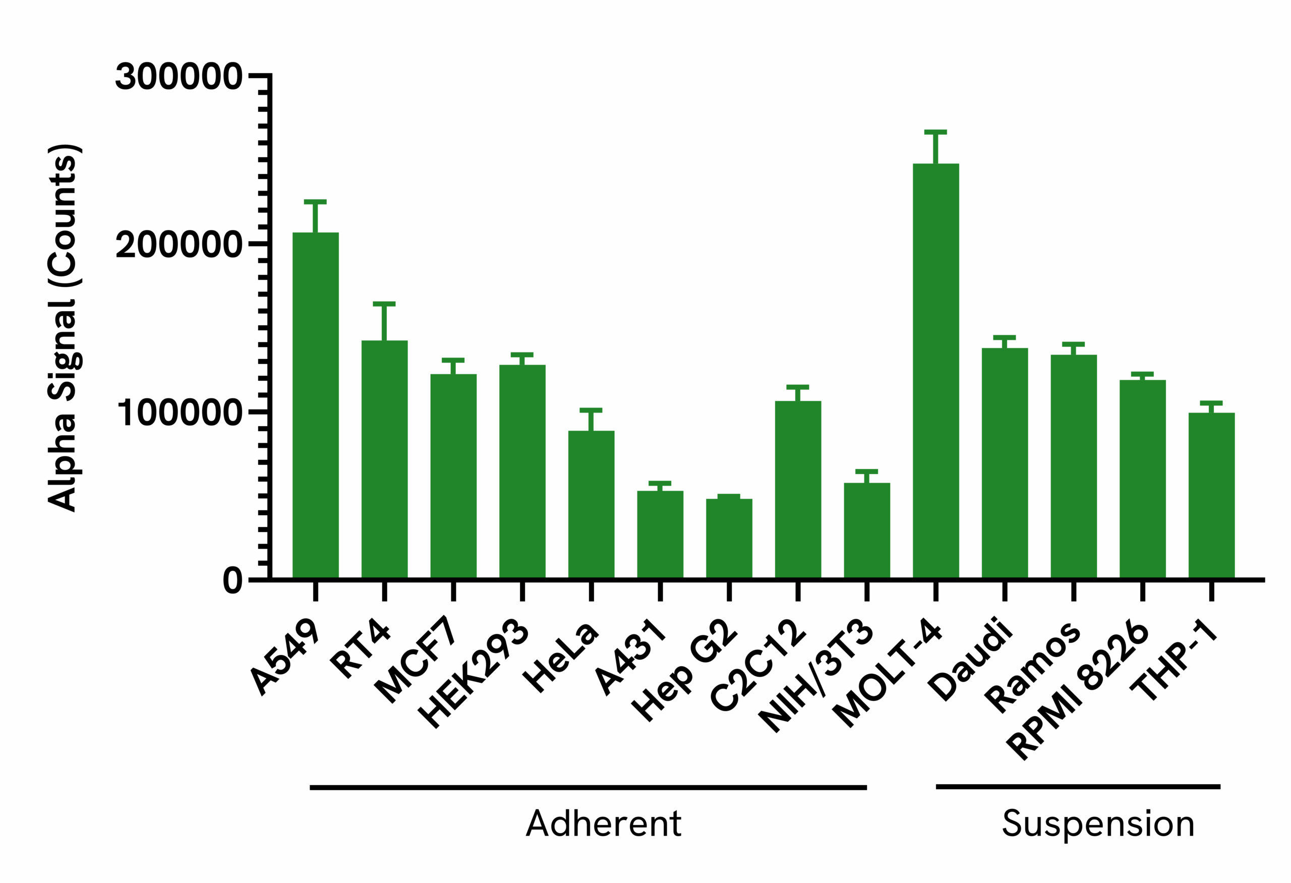 Data obtained from measurement of AKT2 Total in various cell types lysed with Lysis Buffer. Equivalent to approximately 4,000 cells/datapoint (adherent cells) or 40,000 cells/datapoint (suspension cells).