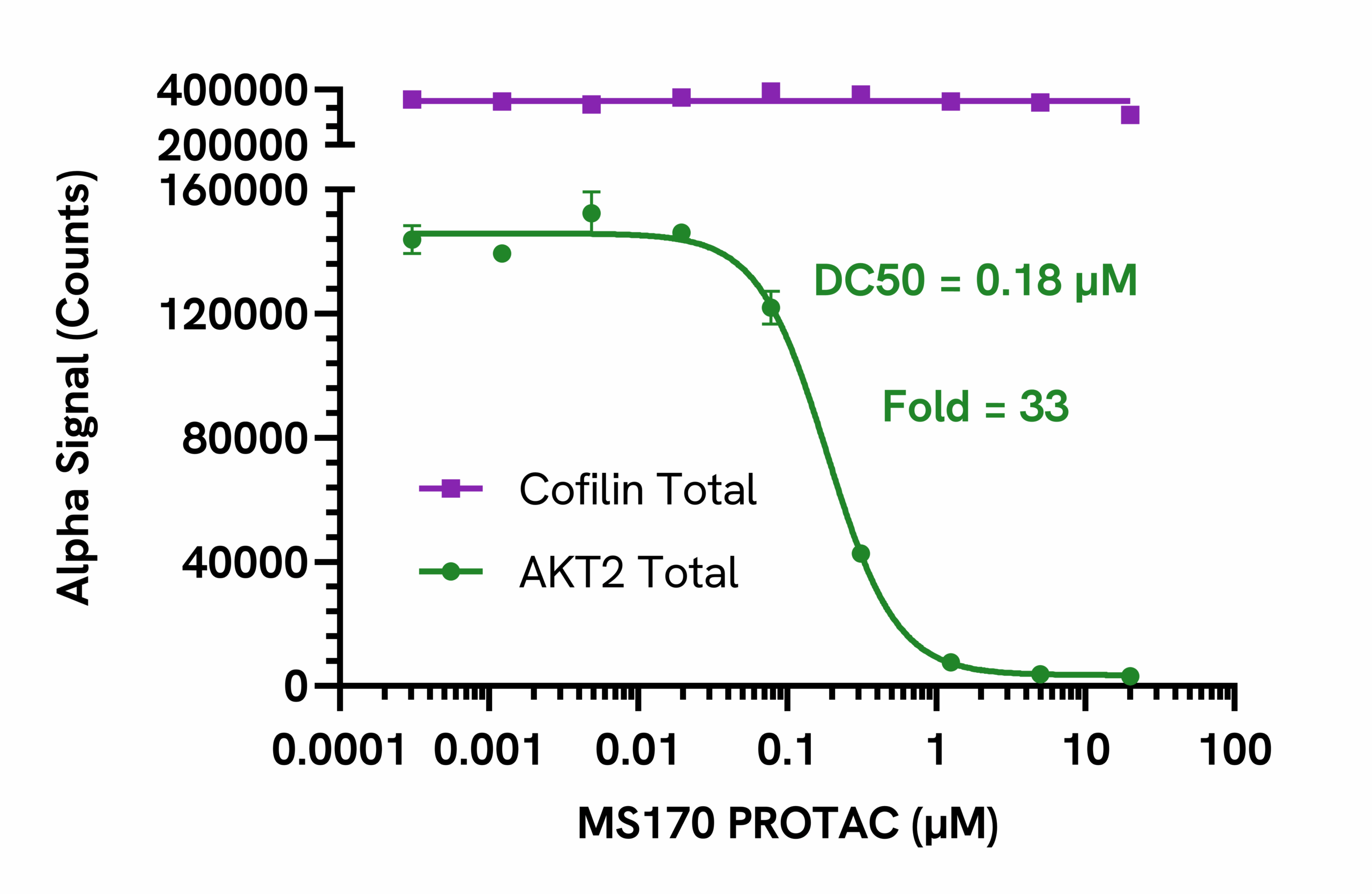 Data obtained with a 2-plate, 2-incubation protocol. PC3 cells were seeded at 40K cells/well in a 96 well plate and incubated overnight. Cells were treated with MC170 PROTAC at the indicated concentrations for 24 hours. Cells were lysed with Lysis Buffer and assayed separately for Total AKT2 and Cofilin using respective SureFire® Ultra™ kits. Equivalent to approximately 4,000 cells/datapoint.