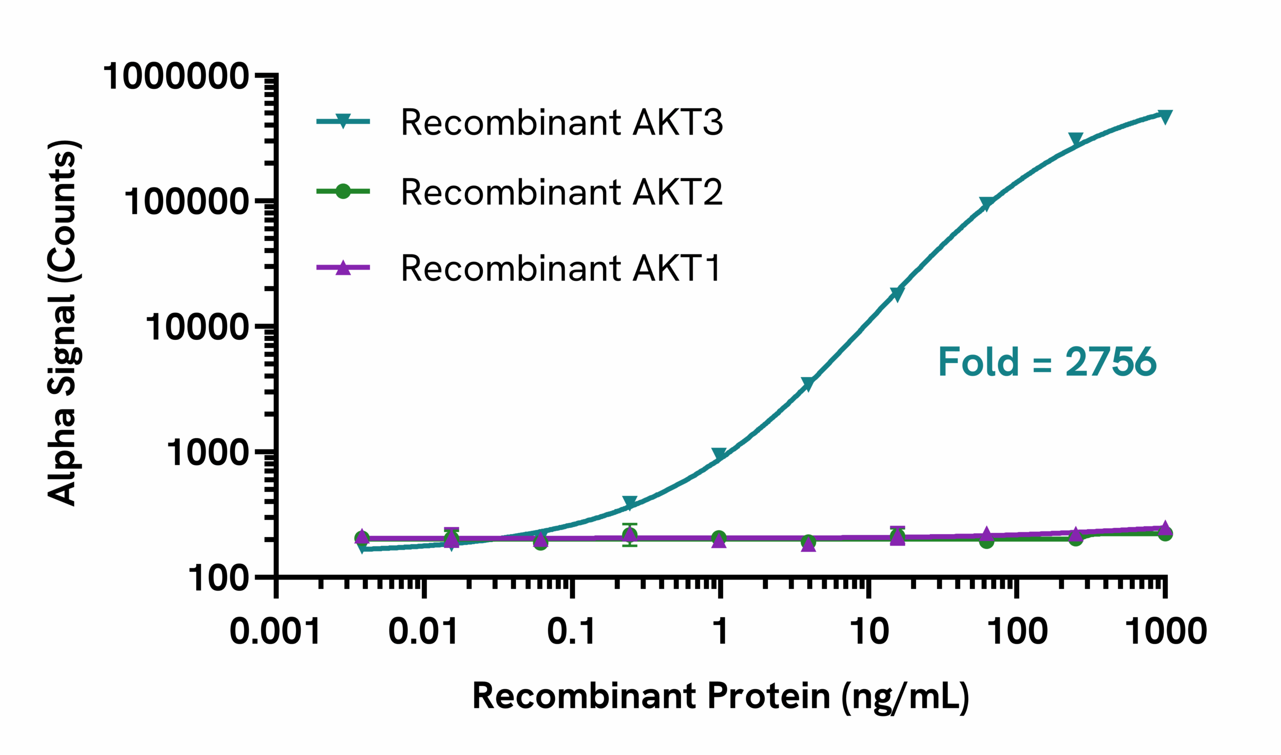 AKT1 (Abcam, ab62279), AKT2 (Abcam, ab60324) and AKT3 (Abcam, ab60324) active recombinant human proteins were serially diluted with Lysis Buffer and evaluated using the AKT3 Total SureFire® Ultra™ kit. No cross-reactivity against AKT1 or AKT2 was observed despite sharing approximately 80% similarity with AKT3.