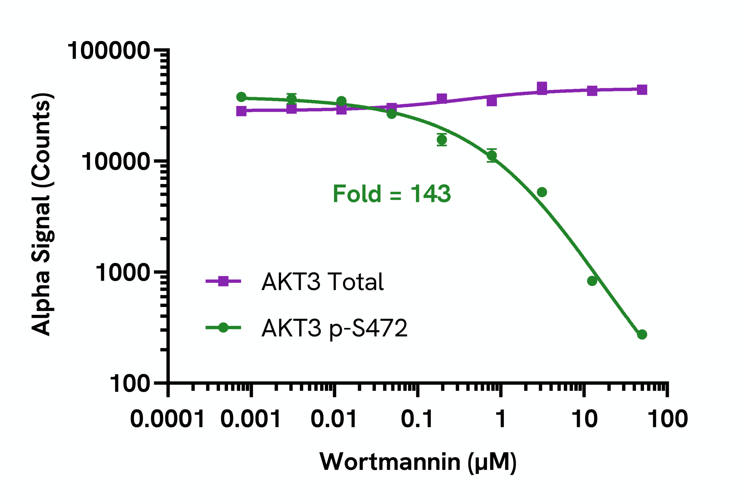 Data obtained with a 2-plate, 2-incubation protocol. HEK293 cells were seeded at 40K cells/well in a 96 well plate and incubated overnight. Cells were treated with Wortmannin at the indicated concentrations for 2 hours. Cells were lysed with Lysis Buffer and assayed separately for Phospho (Ser472) and Total AKT3 using respective SureFire® Ultra™ kits. Equivalent to approximately 4,000 cells/datapoint.