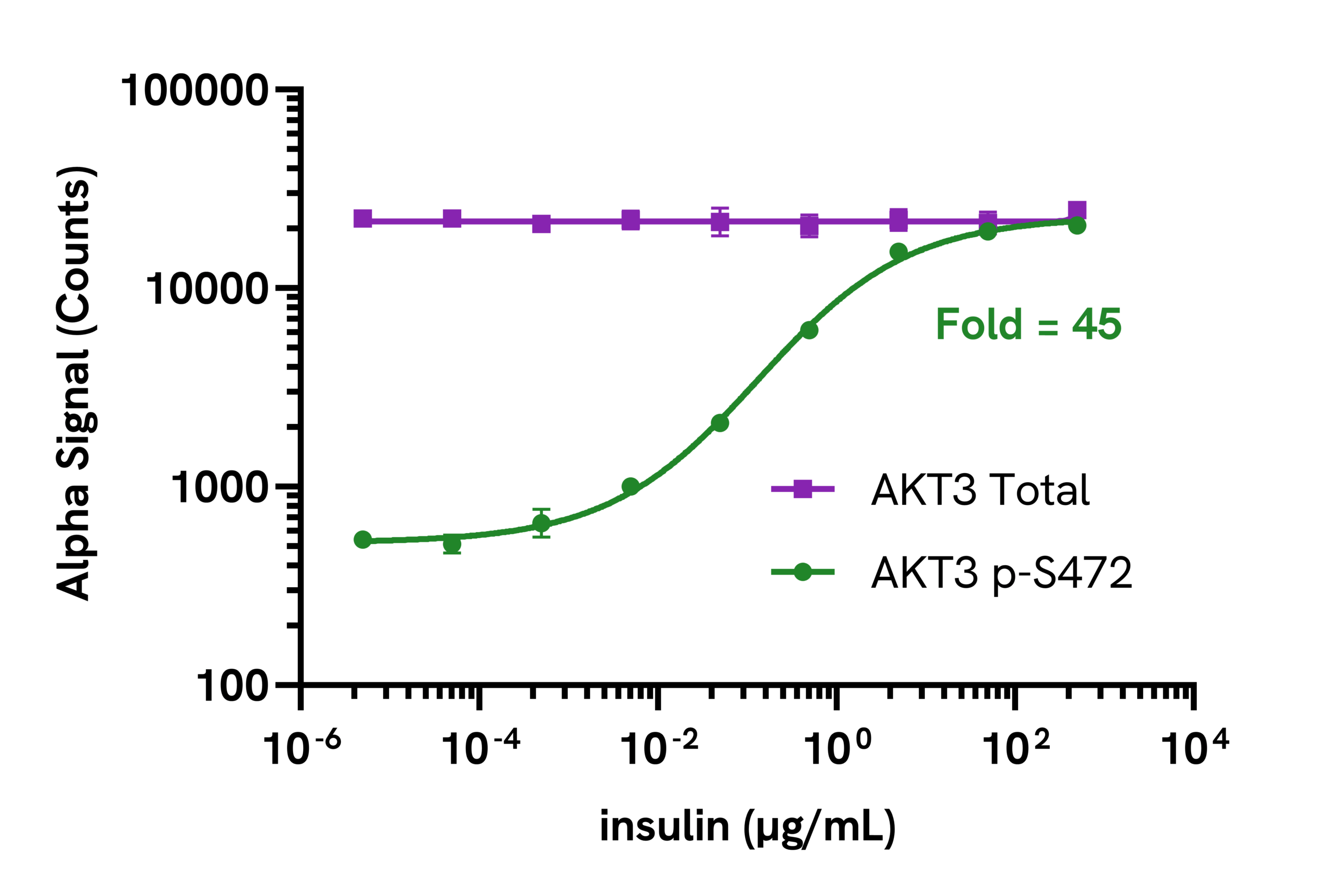 Data obtained with a 2-plate, 2-incubation protocol. SH-SY5Y cells were seeded at 40K cells/well in a 96 well plate and incubated overnight. Cells were serum starved for 2 hours, then treated with insulin at the indicated concentrations for 30 minutes. Cells were lysed with Lysis Buffer and assayed separately for Phospho (Ser472) and Total AKT3 using respective SureFire® Ultra™ kits. Equivalent to approximately 4,000 cells/datapoint.