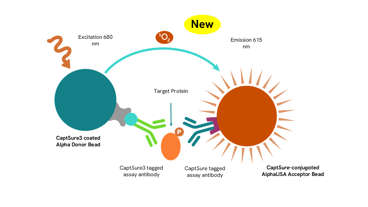 The AlphaLISA™ SureFire® Ultra™ assay enables the rapid and sensitive detection of total and phosphorylated cellular proteins. AlphaLISA™ assays utilize two bead types: Acceptor Beads and Donor Beads. The Acceptor Bead is coated with a proprietary CaptSure™ agent to specifically immobilize the assay specific antibody which is labeled with a CaptSure™ tag. The Donor Bead is coated with streptavidin to capture the biotinylated antibody.