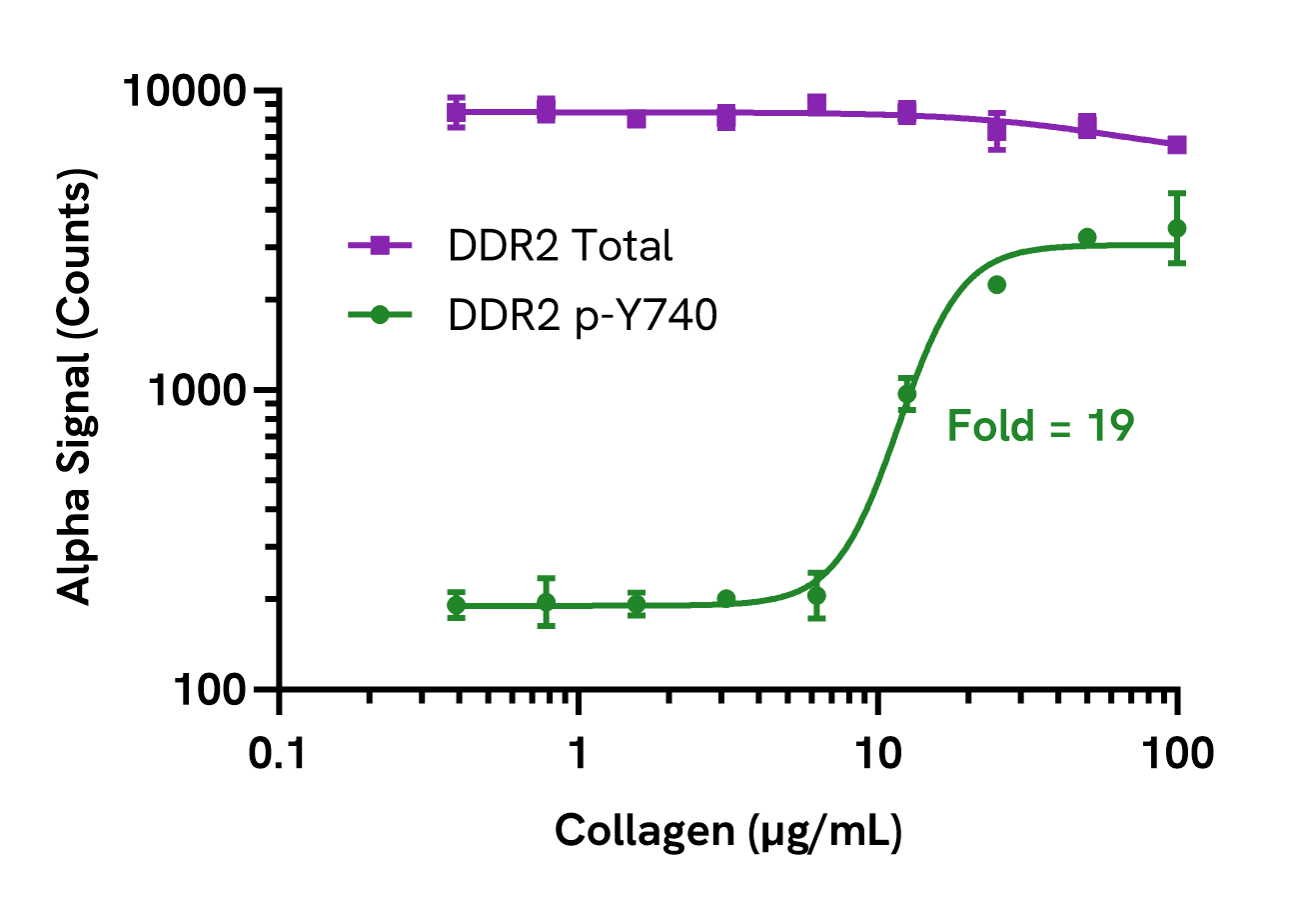 Data obtained with a 2-plate, 2-incubation protocol. HT-1080 cells were seeded at 60K cells/well in a 96 well plate and incubated overnight. Cells were treated with Collagen I at the indicated concentrations for 4 hours. Cells were lysed with Lysis Buffer B and assayed separately for Phospho (Tyr740) and Total DDR2 using respective SureFire® Ultra™ kits. Equivalent to approximately 12,000 cells/datapoint.