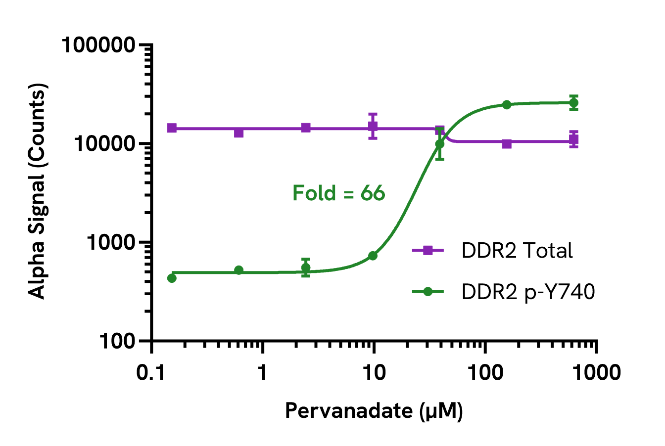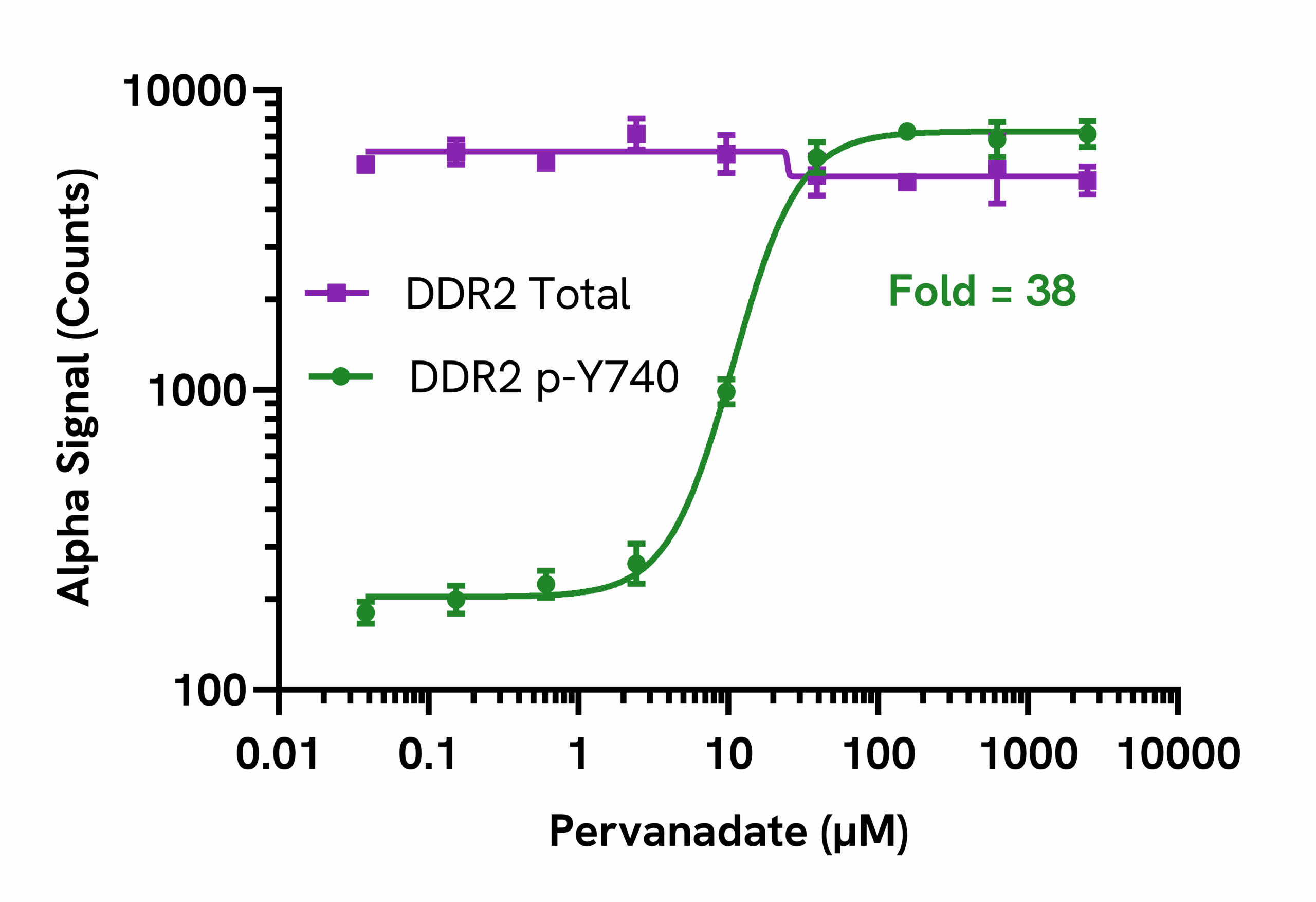 Data obtained with a 2-plate, 2-incubation protocol. RD cells were seeded at 50K cells/well in a 96 well plate and incubated overnight. Cells were treated with Pervanadate at the indicated concentrations for 15 minutes. Cells were lysed with Lysis Buffer B and assayed separately for Phospho (Tyr740) and Total DDR2 using respective SureFire® Ultra™ kits. Equivalent to approximately 10,000 cells/datapoint.