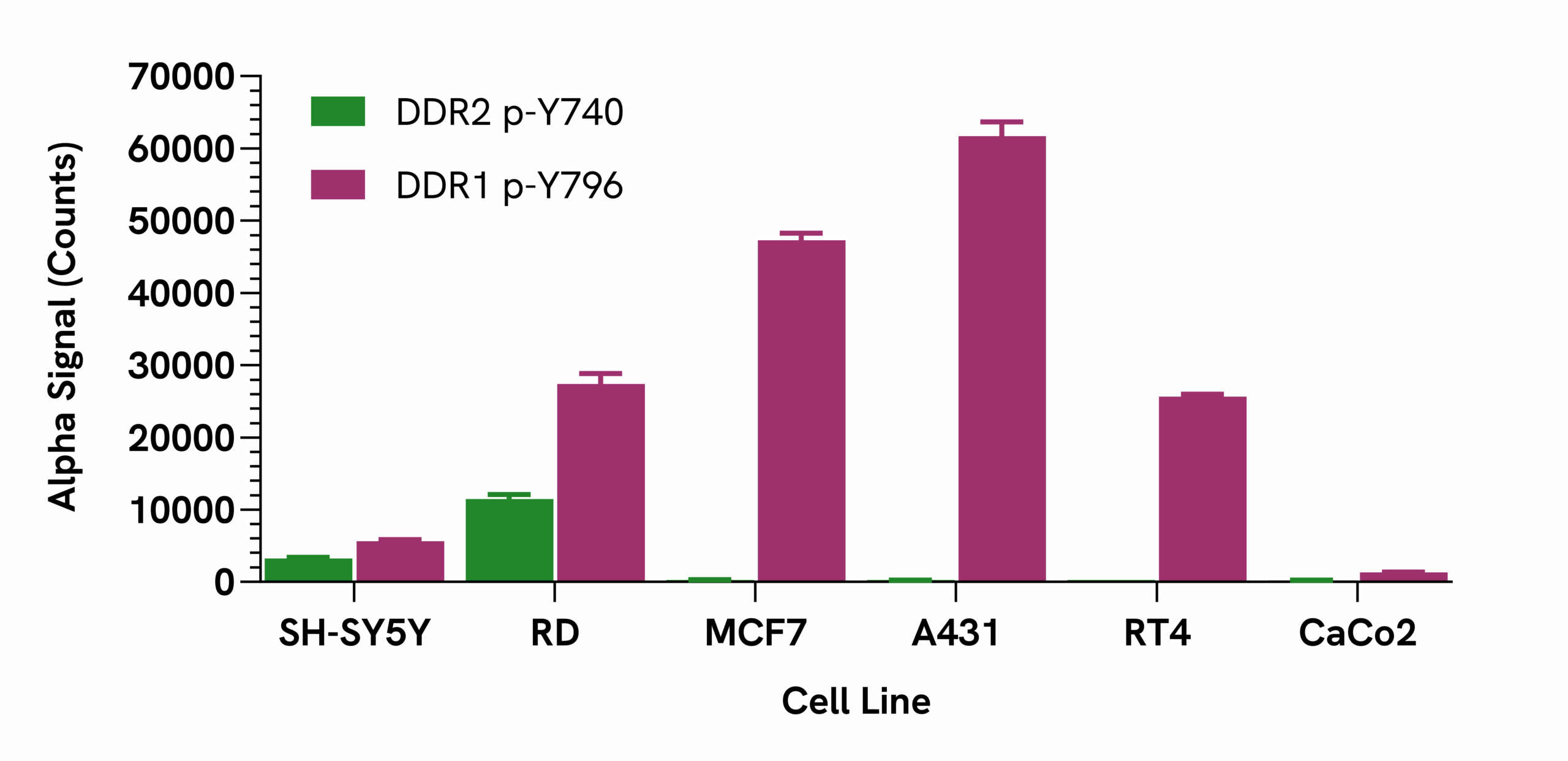 Various cell lines treated with pervanadate were evaluated for DDR2 (Tyr740) and DDR1 (Tyr796) using respective SureFire® Ultra™ kits. A significant difference in expression profiles was observed between DDR2 and DDR1. As expected, DDR2 was only detected in RD and SH-SY5Y cells while DDR1 expression was observed across various cell lines.