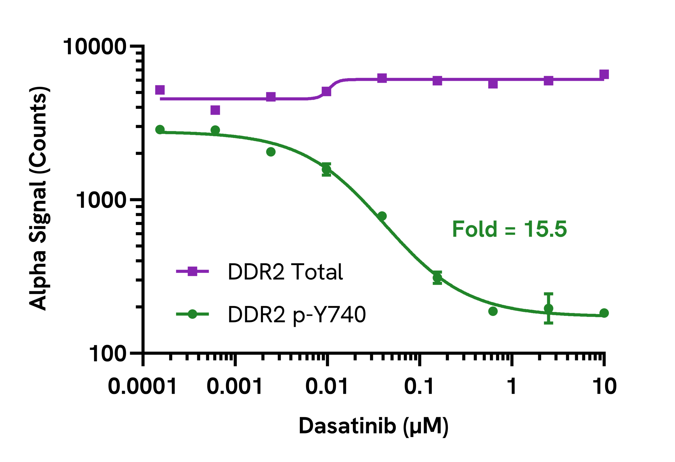 Data obtained with a 2-plate, 2-incubation protocol. HT-1080 cells were seeded at 50K cells/well in a 96 well plate and incubated overnight. Cells were treated with Dasatinib at the indicated concentrations for 2 hours, all media was removed and then followed by a treatment with Collagen I at 100 μg/mL for 4 hours. Cells were lysed with Lysis Buffer B and assayed separately for Phospho (Tyr740) and Total DDR2 using respective SureFire® Ultra™ kits. Equivalent to approximately 10,000 cells/datapoint.