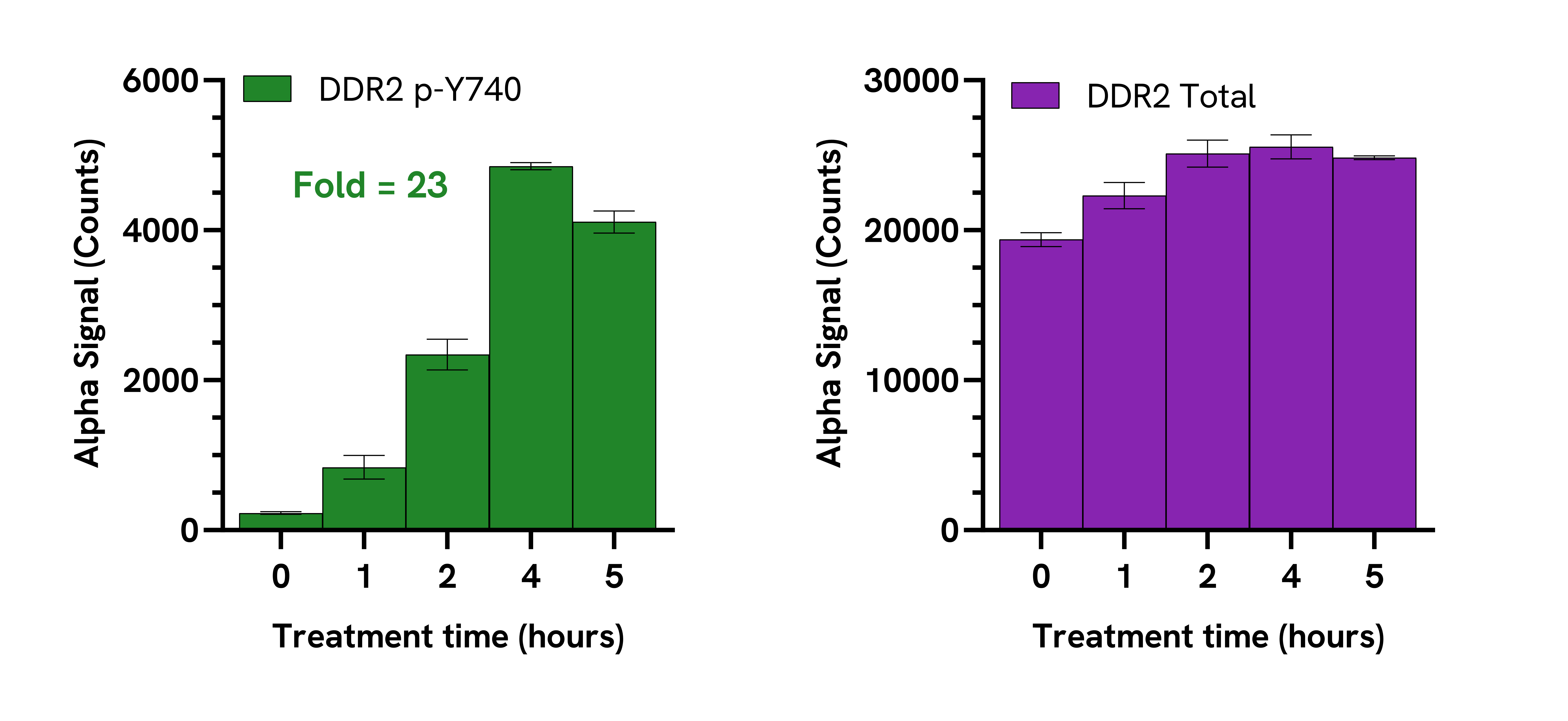 Data obtained with a 2-plate, 2-incubation protocol. HT-1080 cells were seeded at 60K cells/well in a 96 well plate and incubated overnight. Cells were treated with 100 μg/mL Collagen I (derived from rat tail) at the indicated time points. Cells were lysed with Lysis Buffer B and assayed separately for Phospho (Tyr740) and Total DDR2 using respective SureFire® Ultra™ kits. Equivalent to approximately 12,000 cells/datapoint.