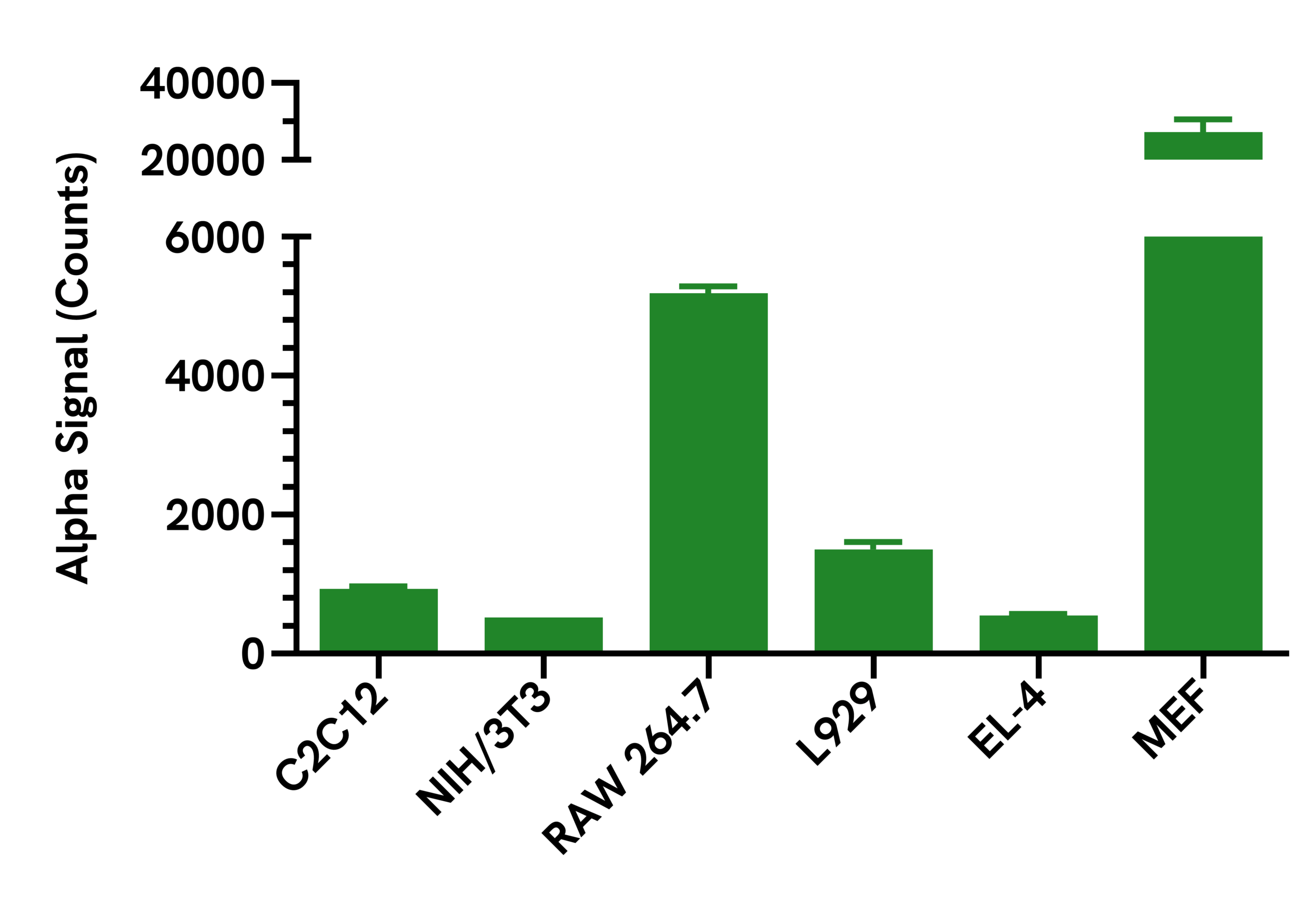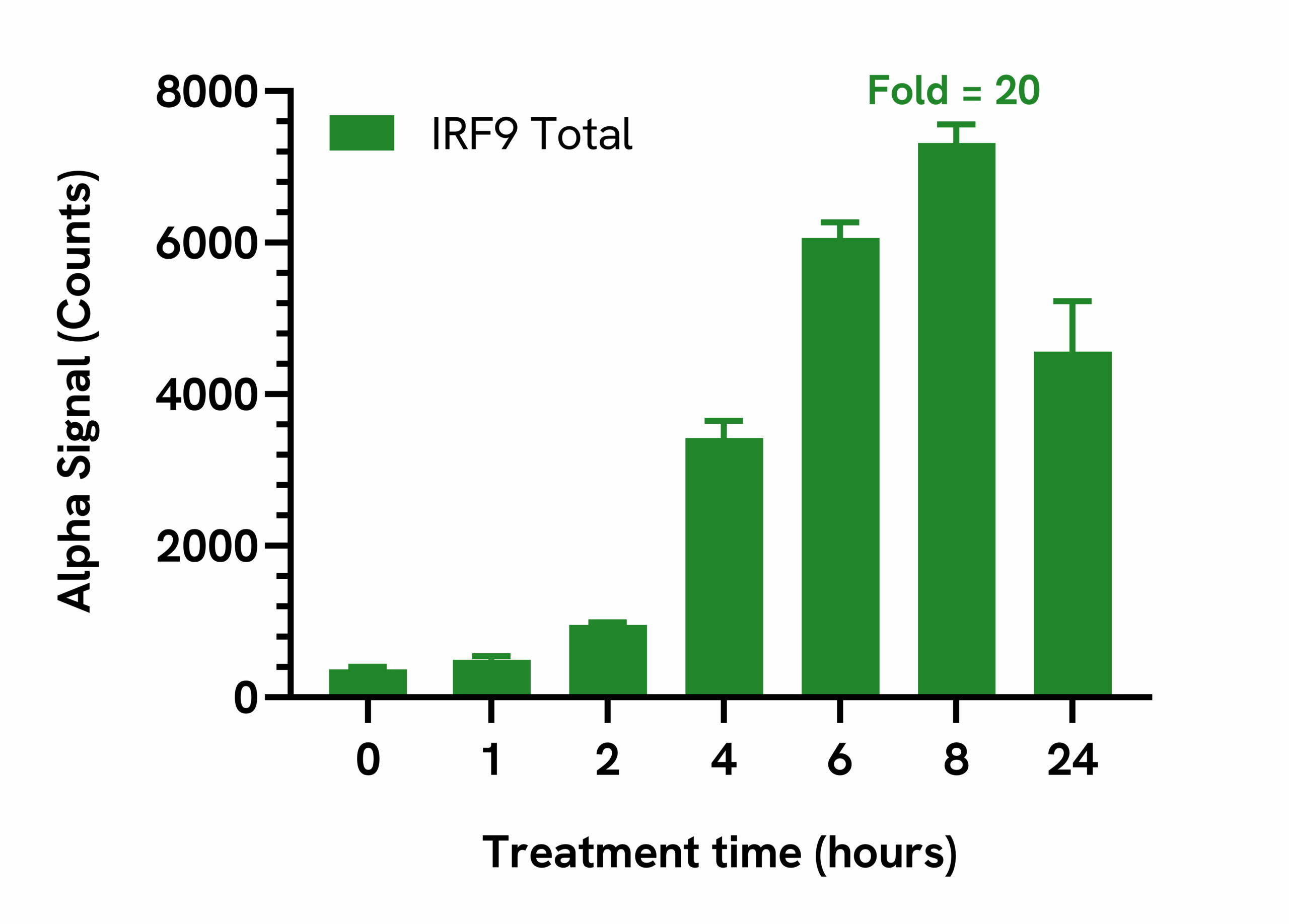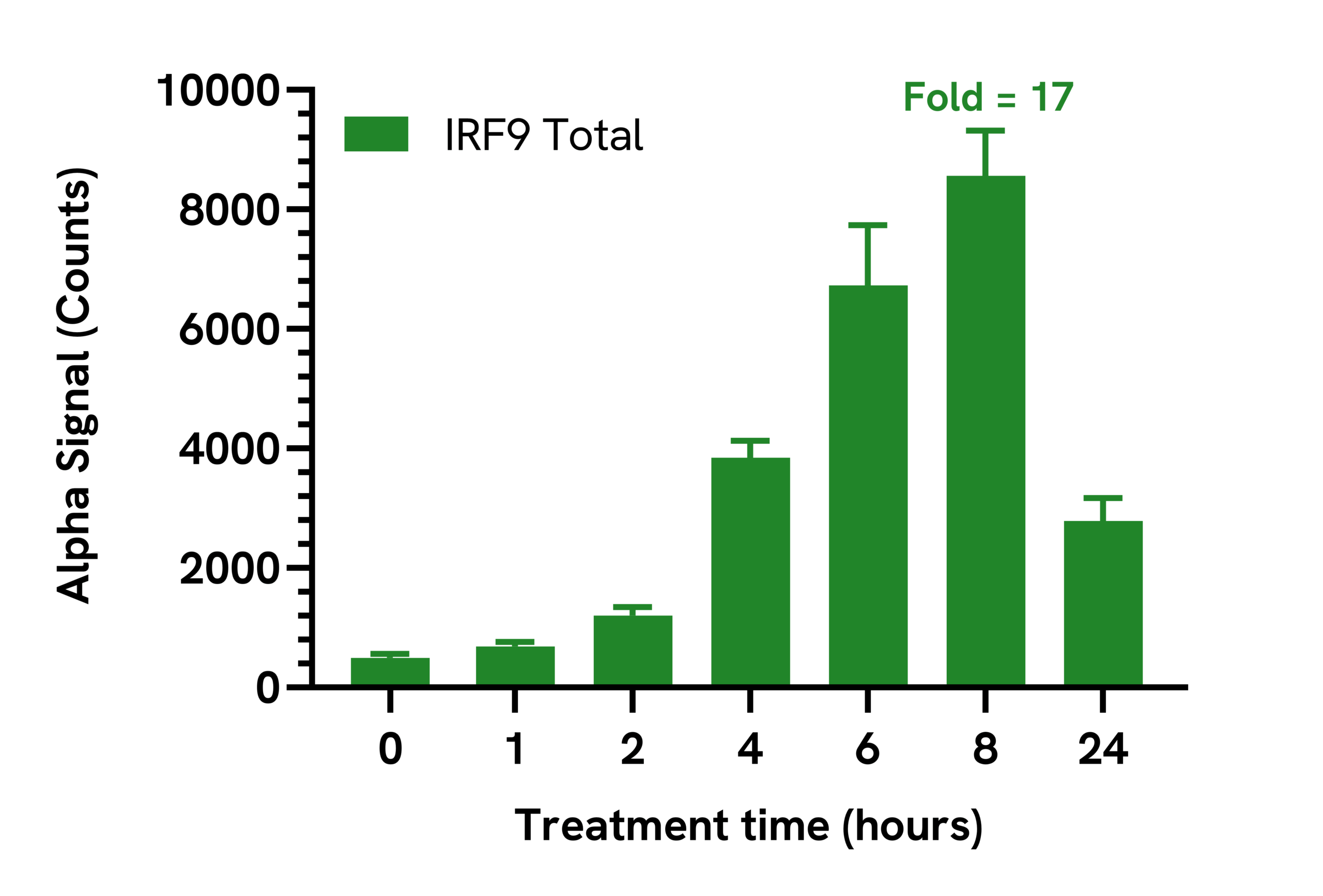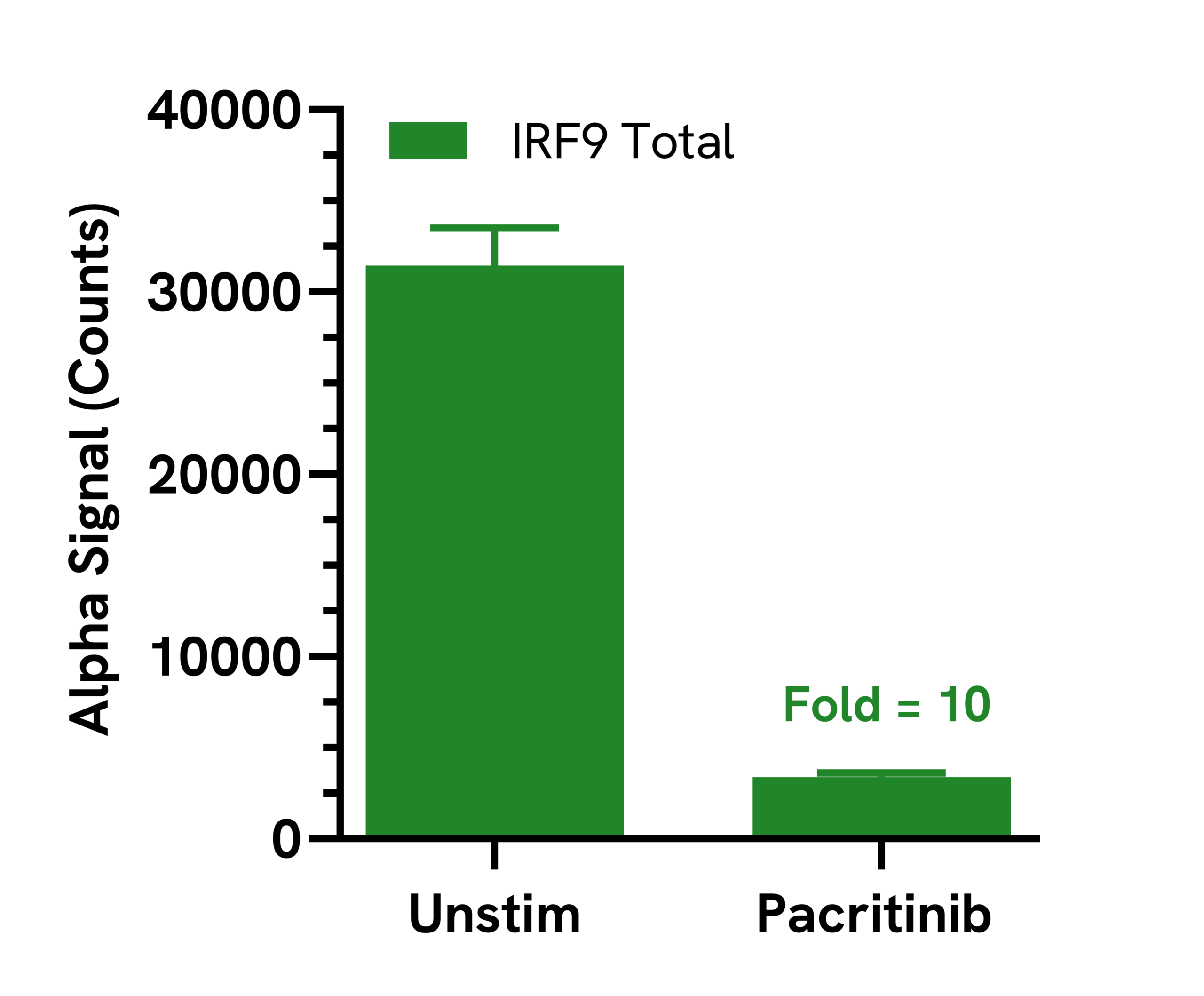 Data obtained with a 2-plate, 2-incubation protocol. RAW 264.7 cells were seeded at 40K cells/well in a 96-well plate and incubated overnight. Cells were treated with 5 μM of JAK inhibitor Pacritinib for 8 hours. Cells were lysed with Lysis Buffer and assayed for IRF9 using the SureFire® Ultra™ kit. Equivalent to approximately 4,000 cells/datapoint.