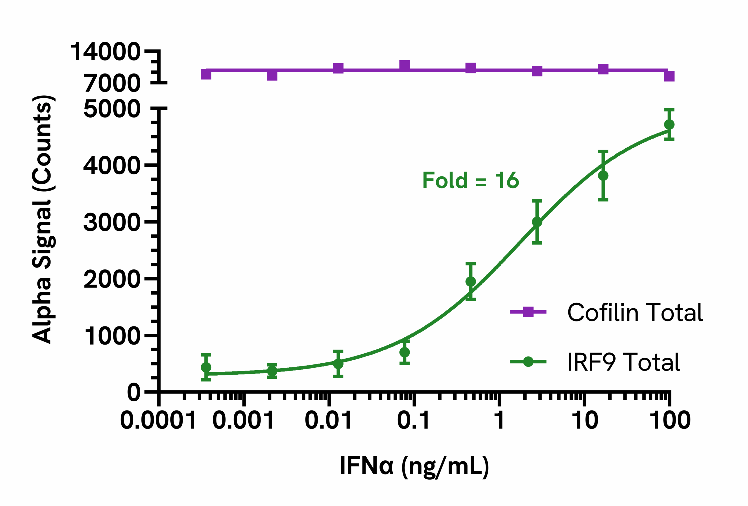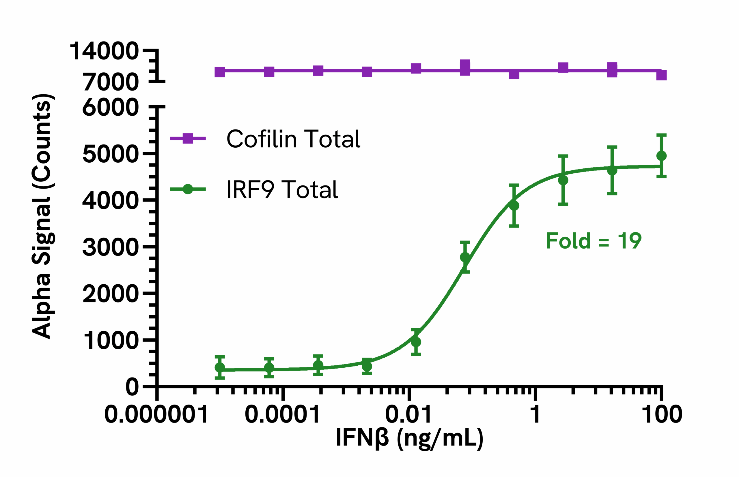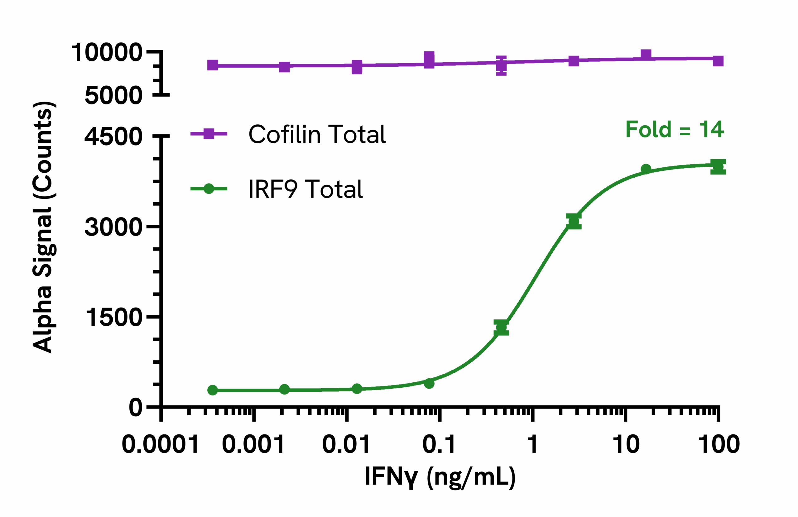 Data obtained with a 2-plate, 2-incubation protocol. NIH/3T3 cells were seeded at 40K cells/well in a 96-well plate and incubated overnight. Cells were treated with IFNα, IFNβ or IFNγ at the indicated concentrations for 8 hours. Cells were lysed with Lysis Buffer and assayed separately for Total IRF9 and Cofilin using respective SureFire® Ultra™ kits. Equivalent to approximately 2,000 cells for IRF9 and 40 cells for Cofilin.