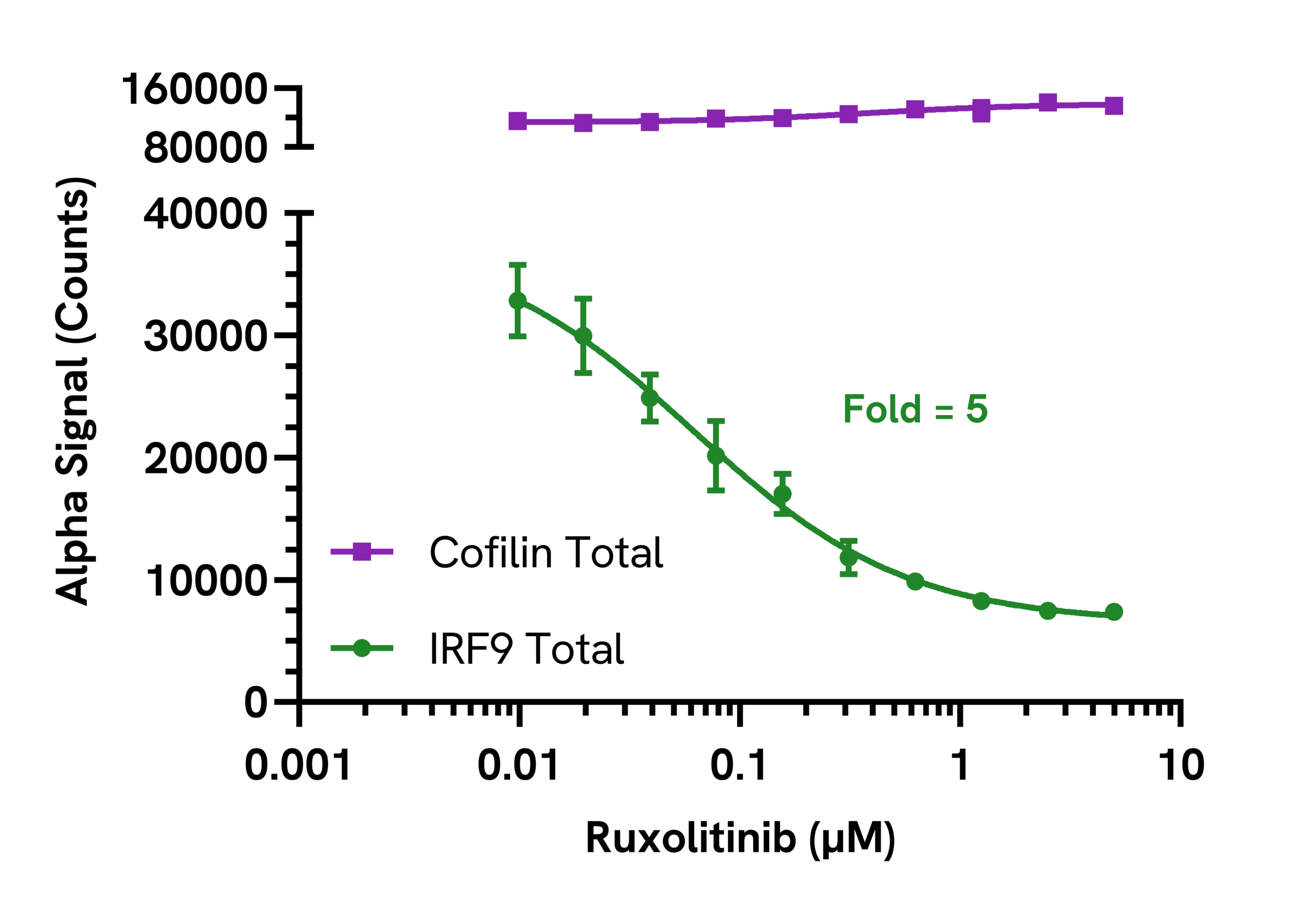 Data obtained with a 2-plate, 2-incubation protocol. RAW 264.7 cells were seeded at 40K cells/well in a 96-well plate and incubated overnight. Cells were treated with JAK inhibitor Ruxolitinib at the indicated concentrations for 8 hours. Cells were lysed with Lysis Buffer and assayed separately for Total IRF9 and Cofilin using respective SureFire® Ultra™ kits. Equivalent to approximately 4,000 cells for IRF9 and 400 cells for Cofilin.