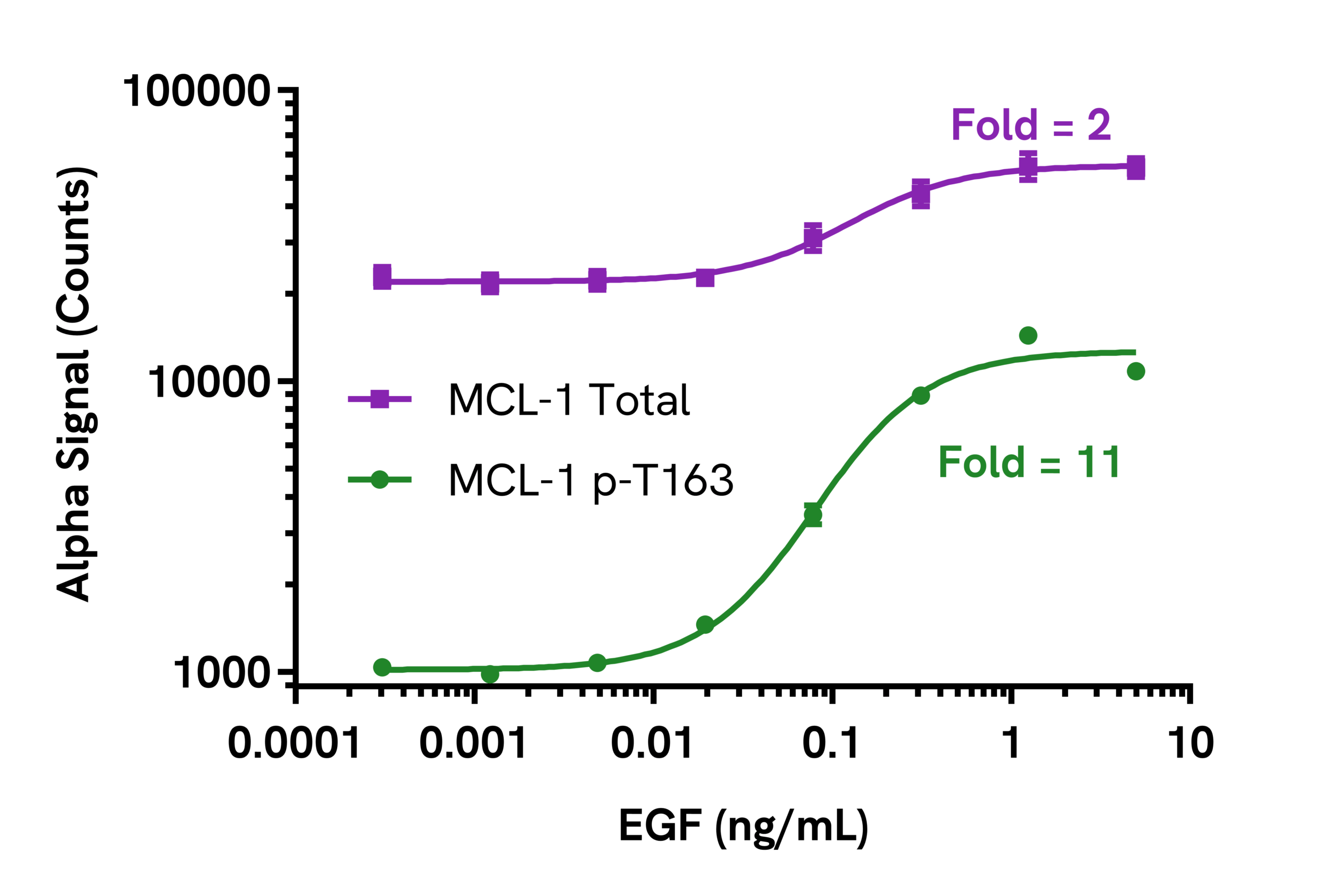 Data obtained with a 2 plate, 2 incubation protocol. HeLa cells were seeded at 20K cells/well in a 96 well plate and incubated overnight. Cells were treated with EGF at the indicated concentrations for 2 hours. Cells were lysed with Lysis Buffer and assayed separately for Phospho (Thr163) and Total MCL-1 using respective SureFire® Ultra™ kits. Equivalent to approximately 2,000 cells/datapoint.