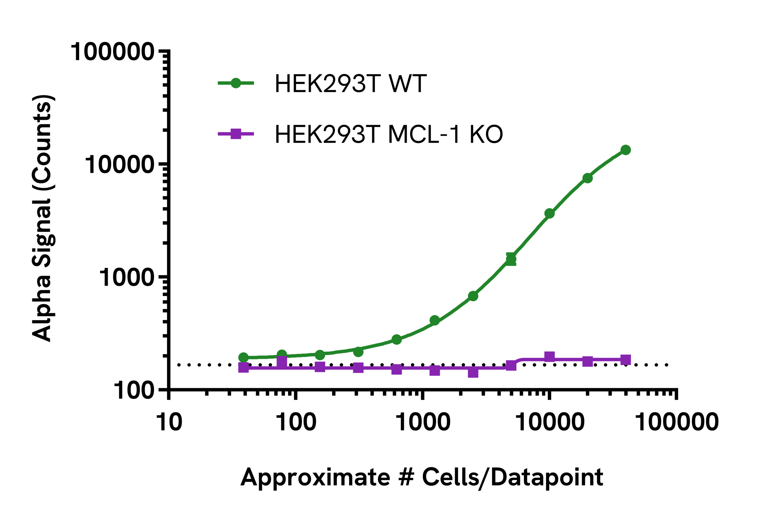 Data obtained with a 2-plate, 2-incubation protocol. HEK293T wild type (WT) and HEK293T MCL-1 knockout (KO, Abcam ab266838) cell lines were seeded at increasing cell densities in a 96 well plate and incubated overnight. Cells were lysed with Lysis Buffer and assayed for Phospho (Thr163) MCL-1 using the SureFire® Ultra™ kit.