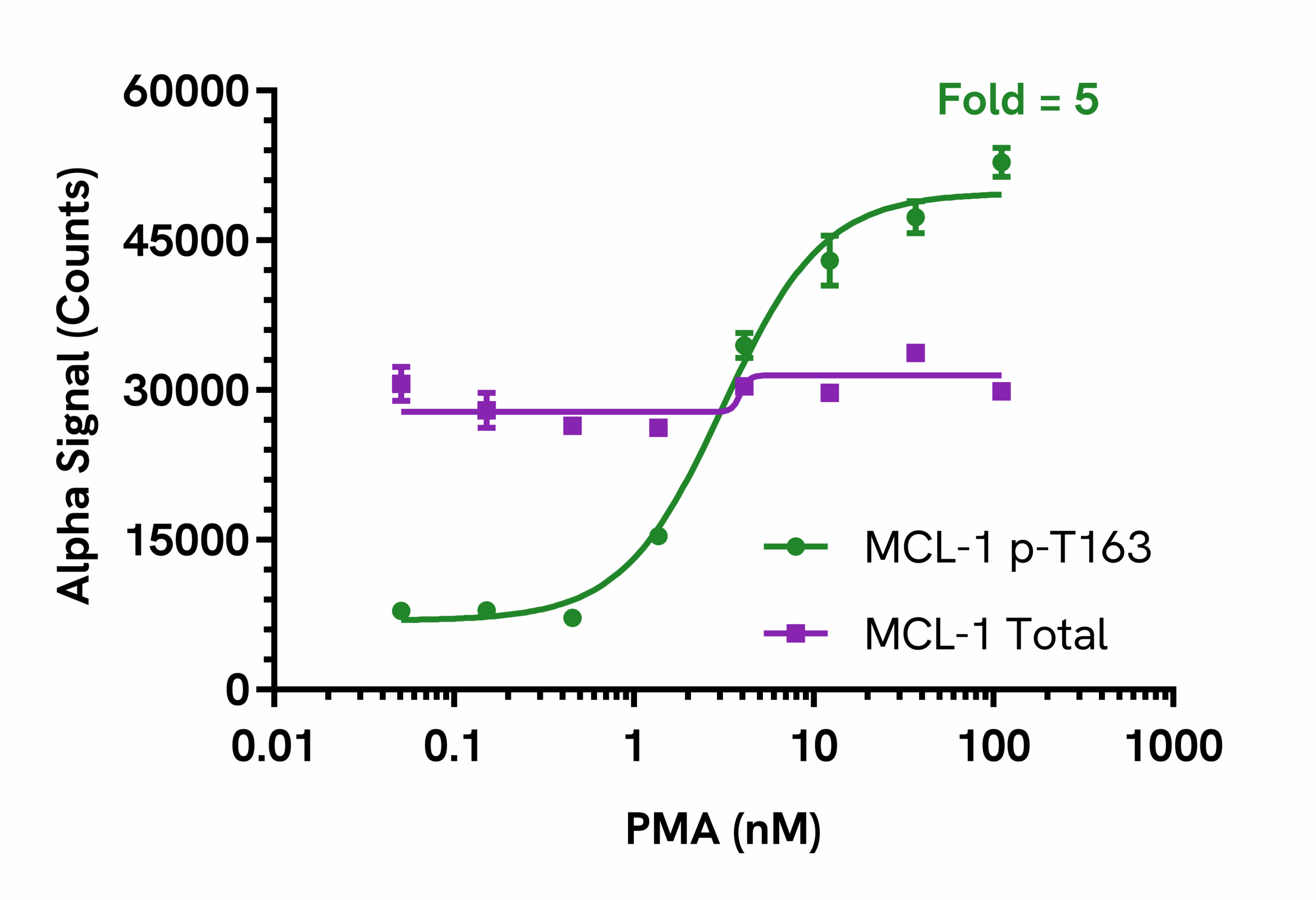 Data obtained with a 2 plate, 2 incubation protocol. Raji cells were seeded at 200K cells/well in a 96 well plate. Cells were treated with PMA at the indicated concentrations for 15 minutes. Cells were lysed with Lysis Buffer and assayed separately for Phospho (Thr163) and Total MCL-1 using respective SureFire® Ultra™ kits. Equivalent to approximately 20,000 cells/datapoint.