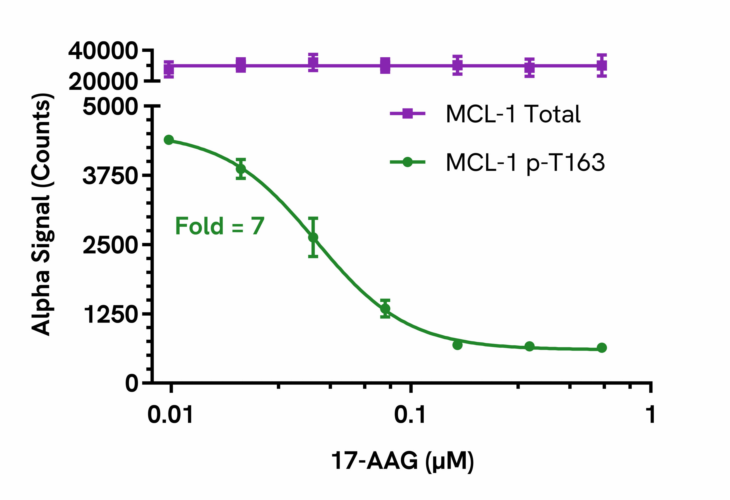 Data obtained with a 2 plate, 2 incubation protocol. THP-1 cells were seeded at 150K cells/well in a 96 well plate in complete medium and treated with 17-AAG (HSP90 inhibitor) at the indicated concentrations for 24 hours. Cells were washed in HBSS and lysed with Lysis Buffer and assayed separately for Phospho (Thr163) and Total MCL-1 using respective SureFire® Ultra™ kits. Equivalent to approximately 15,000 cells/datapoint.