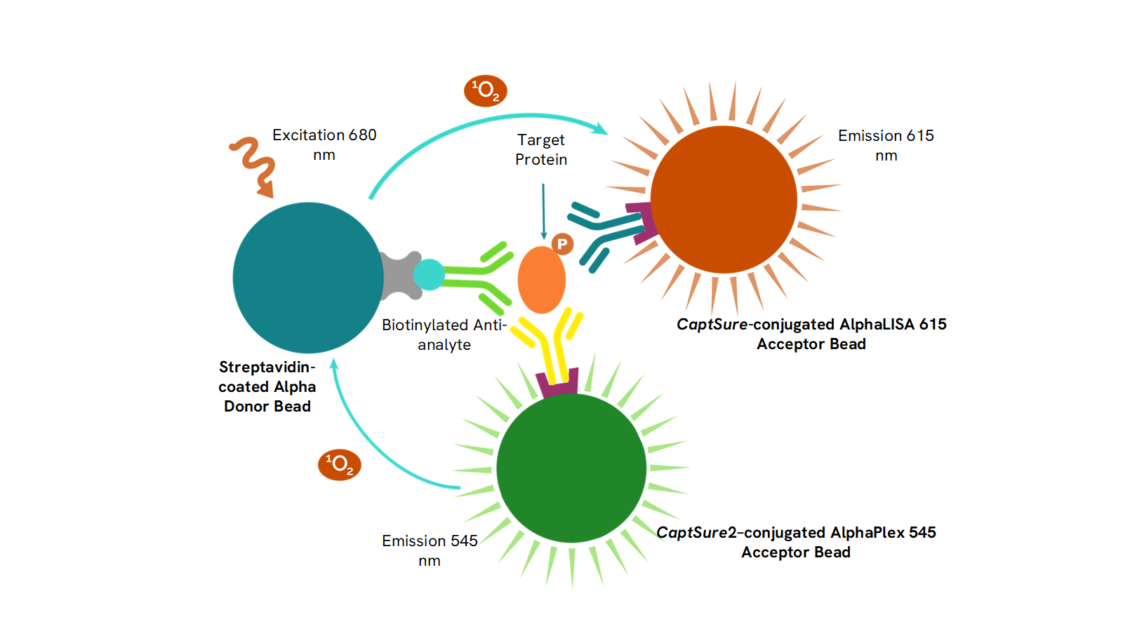 The AlphaLISA™ SureFire® Ultra™ assay enables the rapid and sensitive detection of total and phosphorylated cellular proteins. AlphaLISA™ assays utilize two bead types: Acceptor Beads and Donor Beads. The Acceptor Bead is coated with a proprietary CaptSure™ agent to specifically immobilize the assay specific antibody which is labeled with a CaptSure™ tag. The Donor Bead is coated with streptavidin to capture the biotinylated antibody.