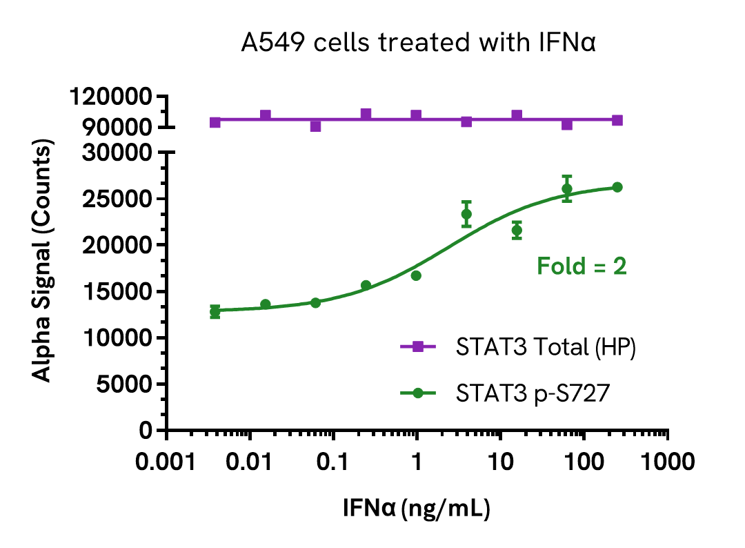 Data obtained with a 2-plate, 2-incubation protocol. A549 cells were seeded at 20K cells/well in a 96-well plate and incubated overnight. Cells were starved for 20 hours in 1% FBS containing media, then treated with increasing concentrations of IFNα for 30 minutes. Cells were lysed with Lysis Buffer and assayed separately for Phospho (Ser727) and Total STAT3 using respective SureFire® Ultra™ kits. Equivalent to approximately 2,000 cells/datapoint.