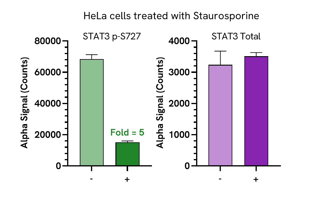 Data obtained with a 2-plate, 2-incubation protocol. HeLa cells were seeded at 20K cells/well in a 96-well plate and incubated overnight. Cells were starved for 20 hours in 1% FBS containing media, then treated with 5 μM Staurosporine for 30 minutes. Cells were lysed with Lysis Buffer and assayed separately for Phospho (Ser727) and Total STAT3 using respective SureFire® Ultra™ kits. Equivalent to approximately 2,000 cells/datapoint.