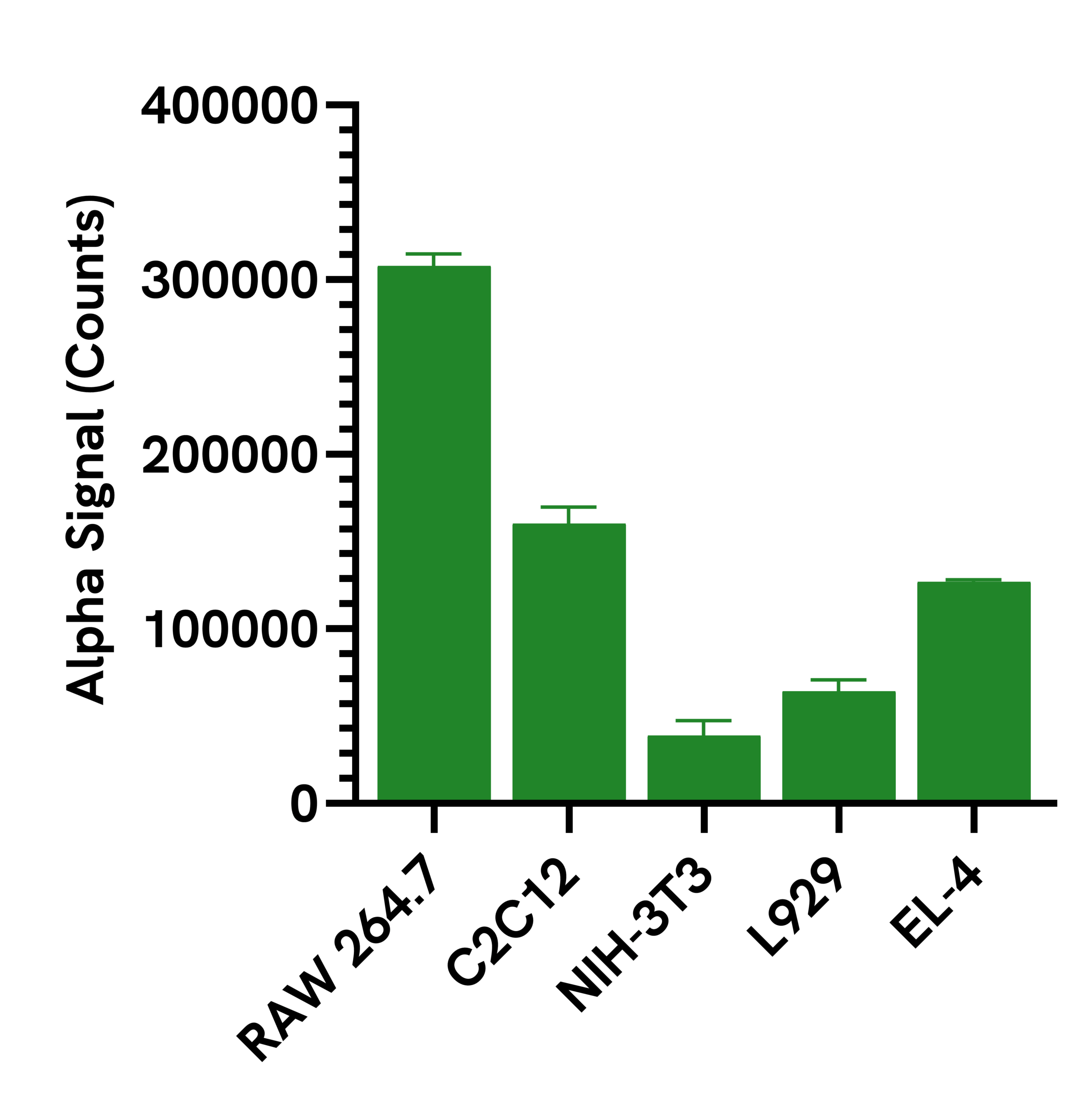 Data obtained from measurement of STING Total in various cell types lysed with Lysis Buffer B. Equivalent to approximately 12,000 cells/datapoint for adherent cells or 20,000 cells/datapoint for suspension cells.